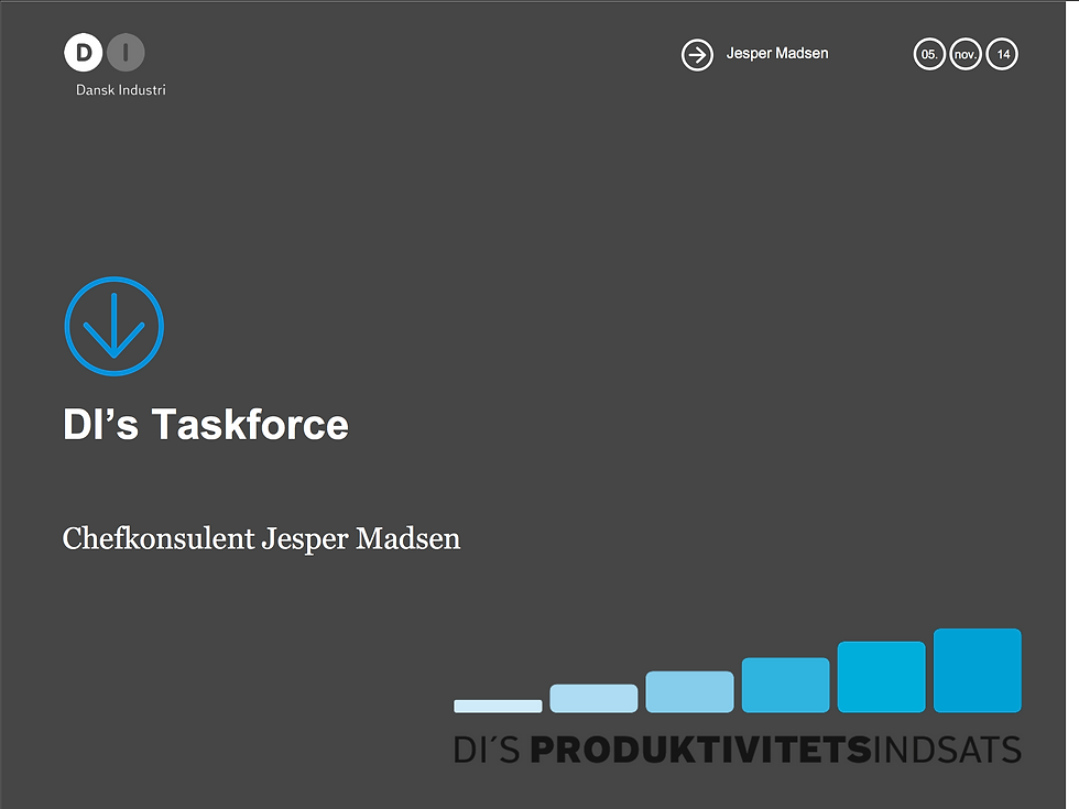 (Tryk på billedet for at se det PDF'ede slide show) Ved en tilfældig søgning på nettet faldt vi over dette slide show. Vi tænker, at der måske er andre, der lige som os finder det interessant, at se hvordan man tænker hos Dansk Industri. Slide showet, der er PDF'et, ligger frit tilgængeligt på nettet, og viser på tydeligste vis hvad vi er oppe imod. I dette slide show kan man se hovedpunkterne, i Chefkonsulent Jesper Madsens, lønomkostnings-reduktions-cirkus. DI's PRODUKTIVITETSindsats... God læselyst, selv hvis du bare skimmer det, vil du få en ide om hvad vi er oppe imod... Læs også "Fleksibel arbejdstid" af Chefkonsulent Jesper Madsen Dansk Industri Læs også "Sådan trimmer du virksomhedens aftaler" af Chefkonsulent Jesper Madsen Dansk Industri
